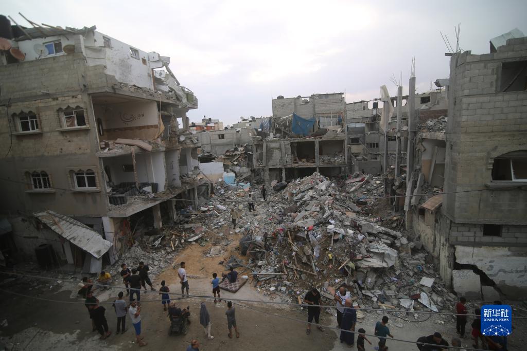 10月9日,在加沙地帶南部城市拉法,人們聚集在以色列空襲后的建筑廢墟旁。