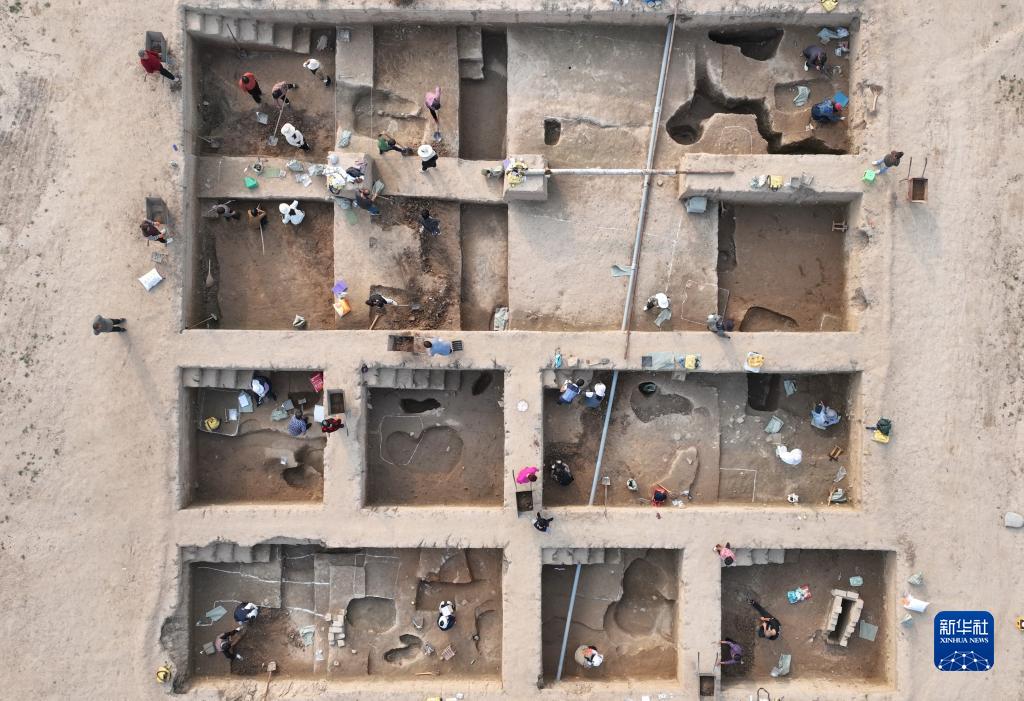 考古隊員在河北省隆堯縣柏人城遺址第四次考古發(fā)掘現場(chǎng)作業(yè)(10月8日攝,無(wú)人機照片)。