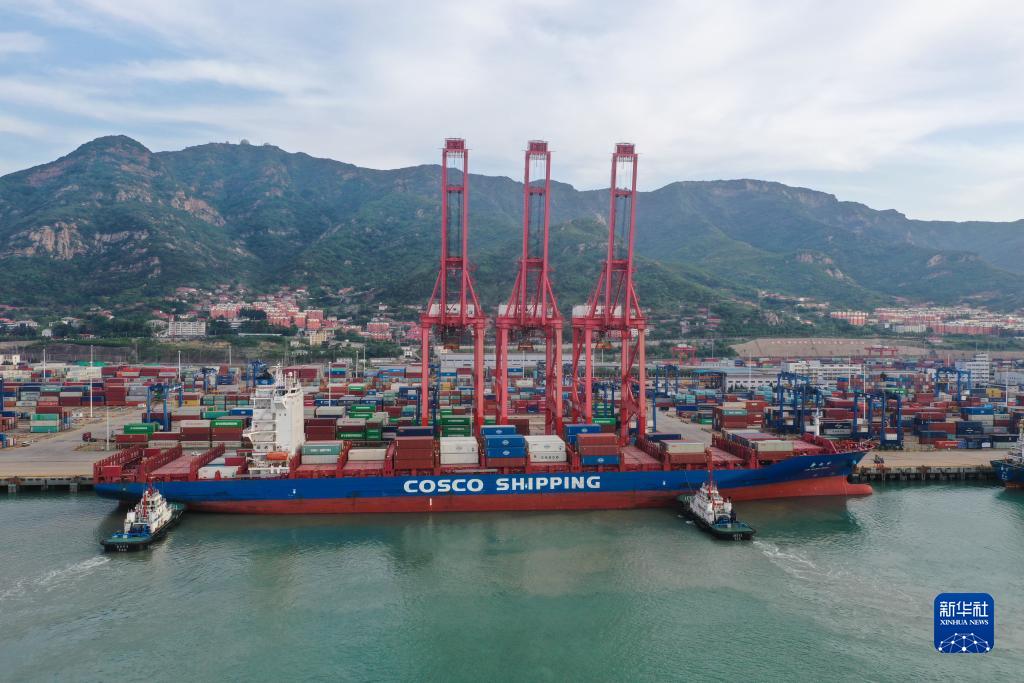 5月9日,貨輪??吭谶B云港港集裝箱碼頭(無(wú)人機照片)。