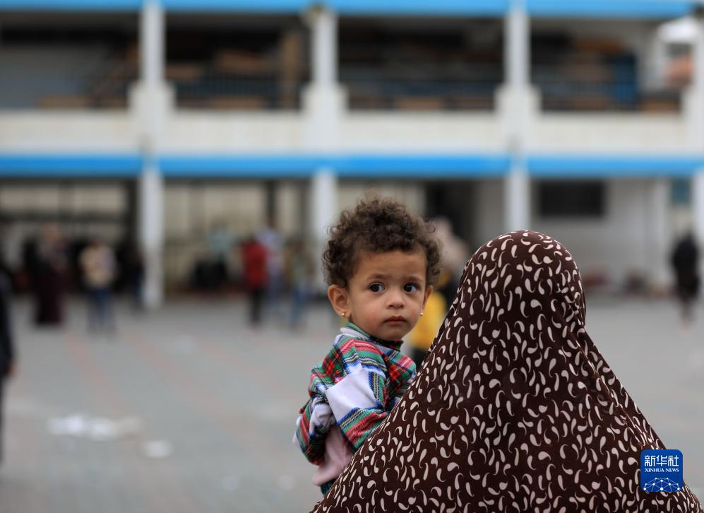 10月9日,一名婦女抱著(zhù)小孩在加沙地帶南部城市汗尤尼斯的一所學(xué)校躲避以色列空襲。