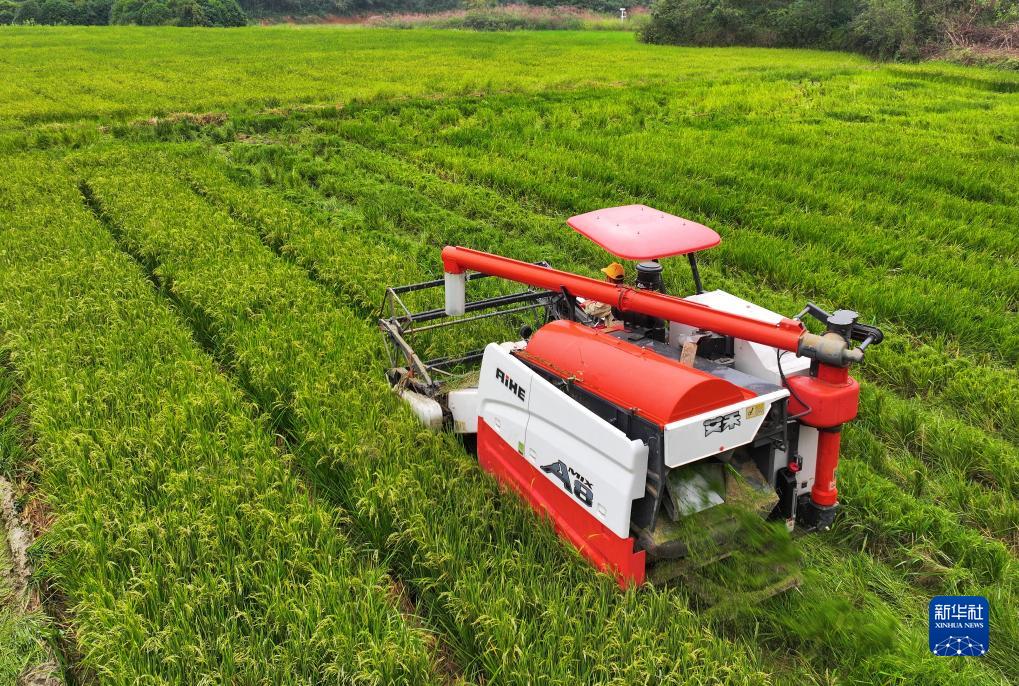 10月10日,農機手駕駛收割機在湖南省靖州苗族侗族自治縣甘棠鎮溪口村收割制種水稻(無(wú)人機照片)。