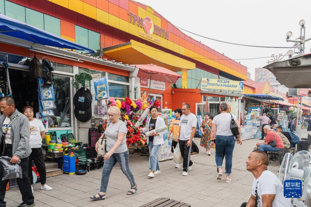 7月25日,人們在俄羅斯布拉戈維申斯克的“三只鯨魚(yú)”中國市場(chǎng)購物。