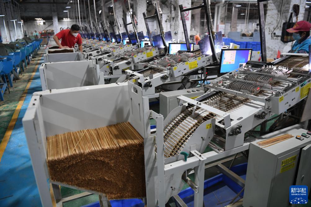 10月9日,在廣東廣寧縣一家竹制品廠(chǎng),工作人員維護竹簽自動(dòng)化生產(chǎn)設備。