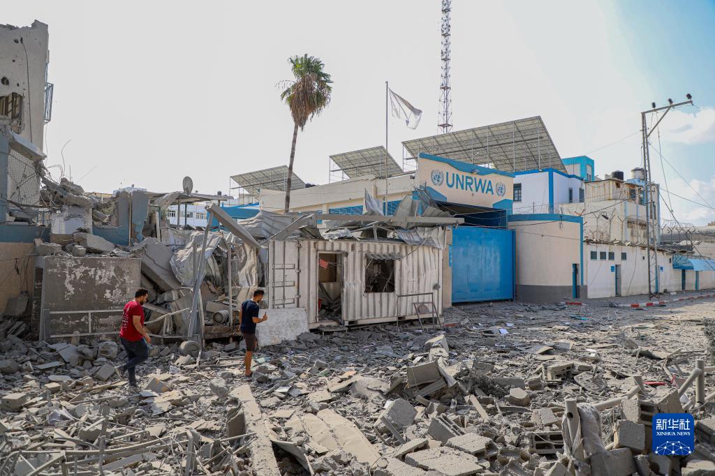 10月10日,在加沙城,人們走過(guò)被以色列空襲炸毀的建筑廢墟。