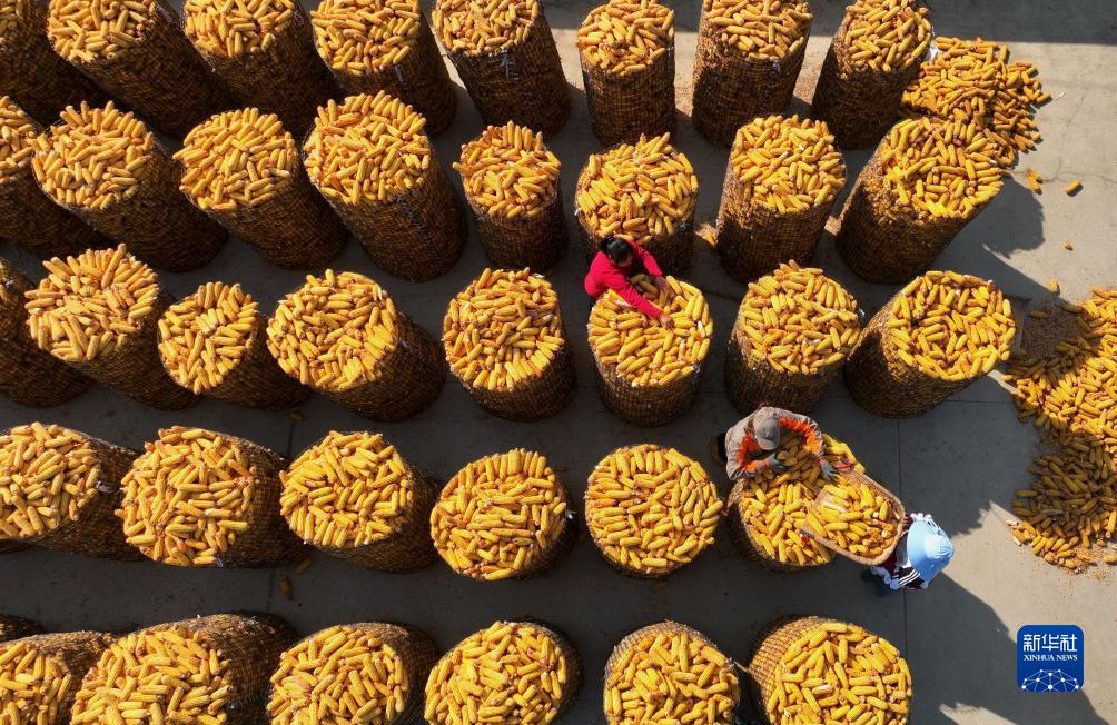 10月10日,河北省遵化市劉備寨鄉尚莊屯村的農民將收獲的玉米裝入糧囤(無(wú)人機照片)。