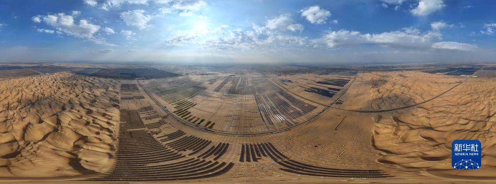 這是10月10日拍攝的建設中的庫布其沙漠鄂爾多斯中北部新能源基地(無(wú)人機合成照片)。