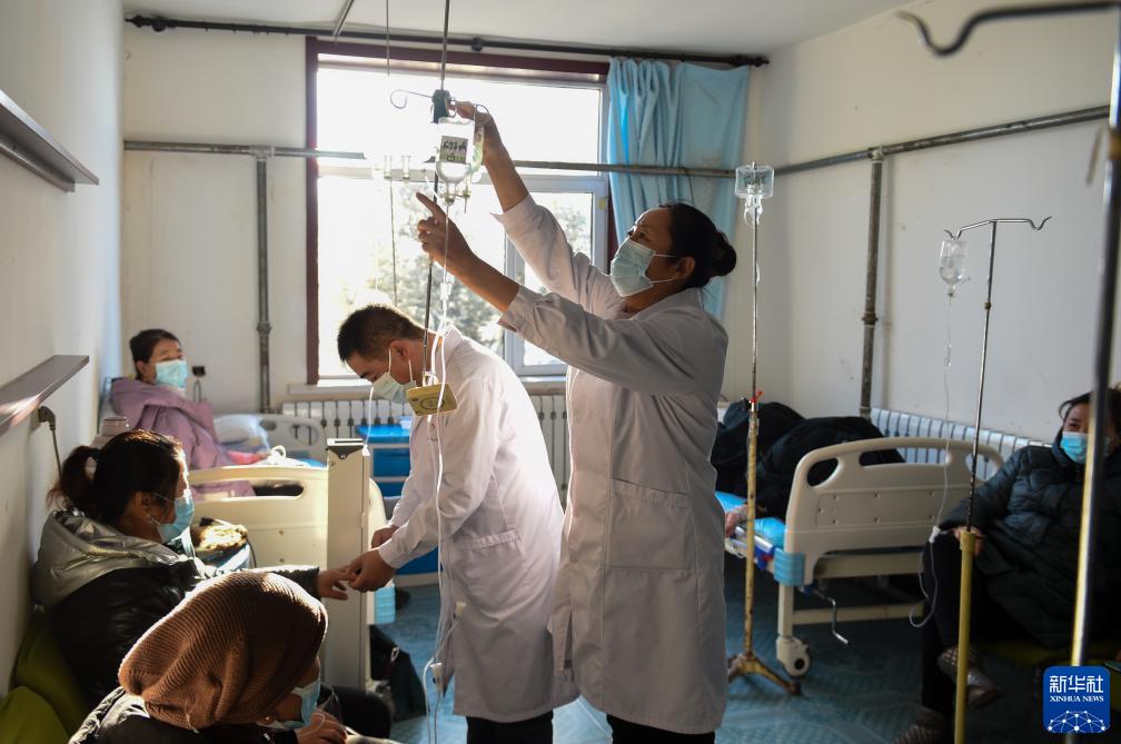 在內蒙古錫林郭勒盟西烏珠穆沁旗的巴彥高勒衛生院,院長(cháng)姚春明和妻子陳麗華為前來(lái)就診的牧民輸液(2023年1月7日攝)。他們在這里已經(jīng)工作了20個(gè)年頭。