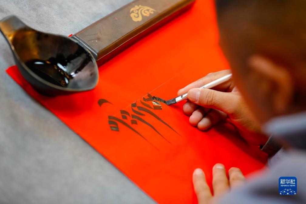 10月10日,在四川甘孜藏族自治州理塘縣,藏族書(shū)法家昂旺曲批為一對新人書(shū)寫(xiě)藏文書(shū)法作品。