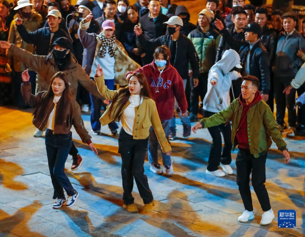 10月10日,人們在四川甘孜藏族自治州理塘縣勒通古鎮跳鍋莊舞。