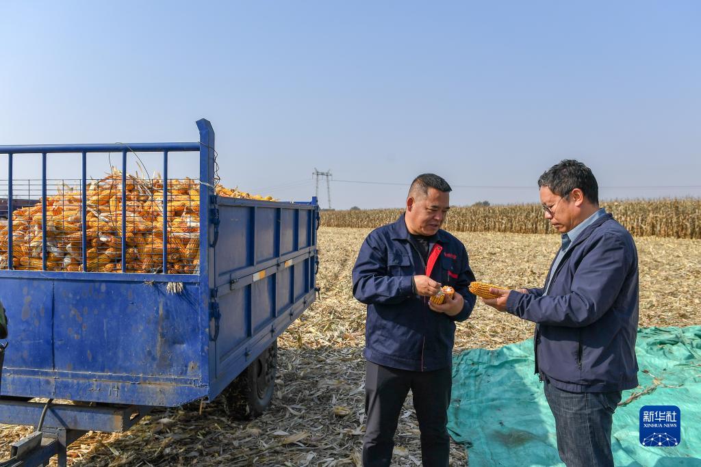 10月11日,在吉林省公主嶺市范家屯鎮孟家村,正高級農藝師邱英楠(右)向乾程農民專(zhuān)業(yè)合作社理事長(cháng)王成了解秋收情況。