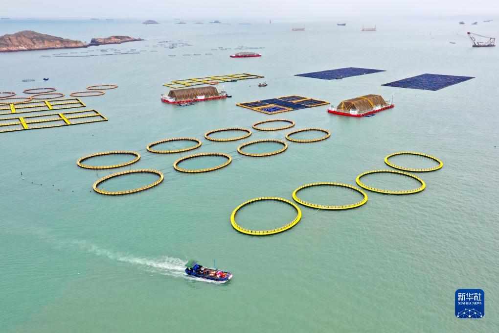 10月10日,福建省連江縣定海灣內漁船經(jīng)過(guò)深水網(wǎng)箱、漁排及深遠海養殖平臺(無(wú)人機照片)。