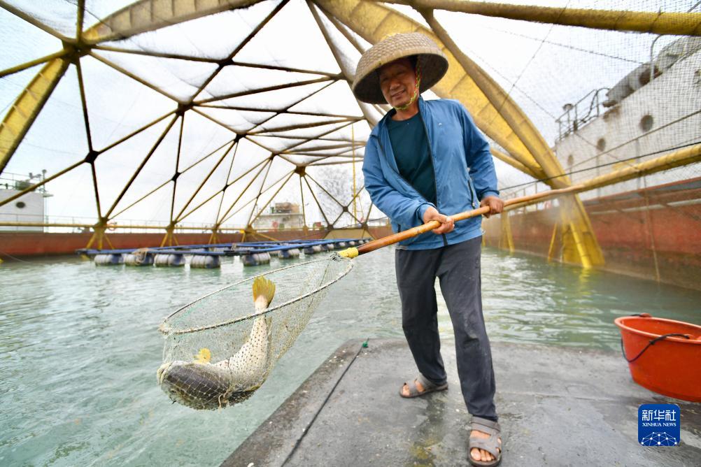 10月10日,在福建省連江縣“定海灣1號”深遠海養殖平臺,工人打撈養殖大黃魚(yú)。