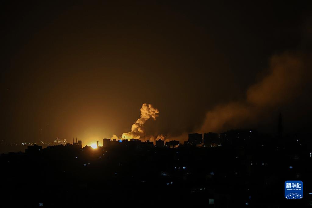 10月11日凌晨,加沙城的建筑遭以色列空襲后升起濃煙。