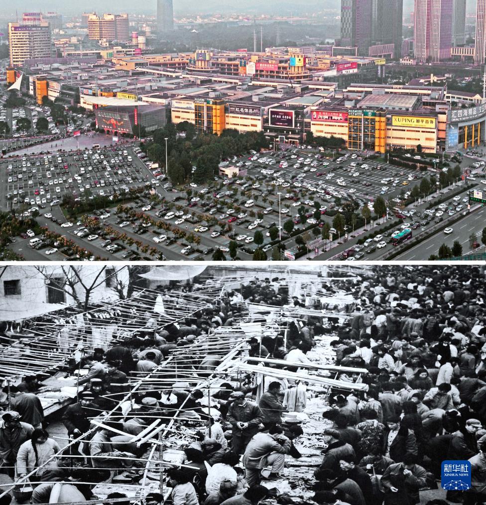 這是一張拼版照片,上圖為:2018年10月24日拍攝的義烏國際商貿城一區市場(chǎng)(新華社記者譚進(jìn)攝);下圖為:1982年9月開(kāi)業(yè)的義烏第一代小商品市場(chǎng)的資料照片(新華社發(fā))。