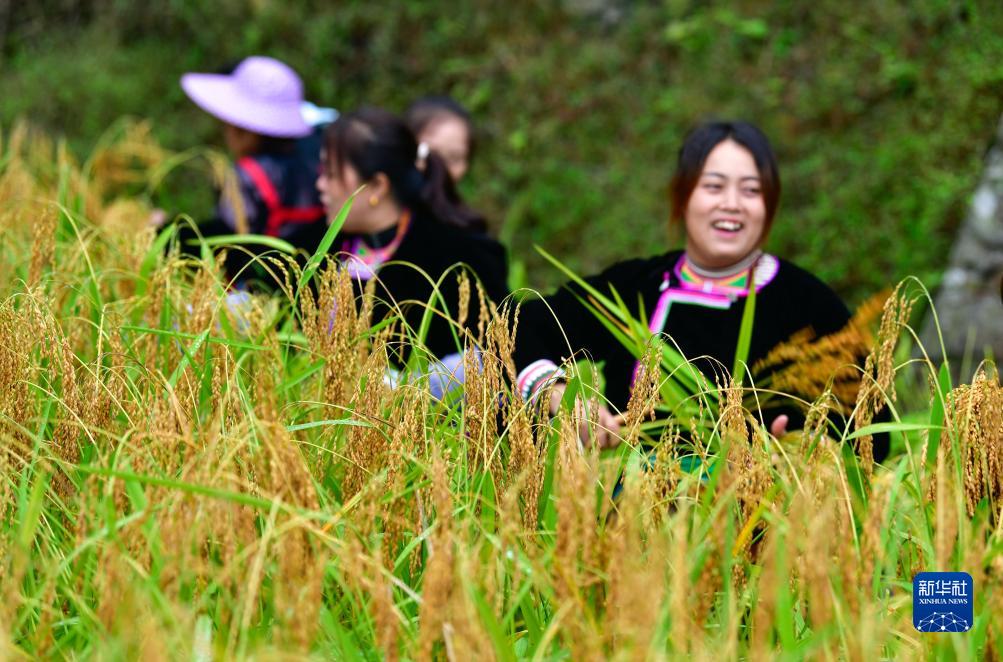 10月11日,村民在貴州省從江縣高增鄉建華村采收香禾糯稻谷。