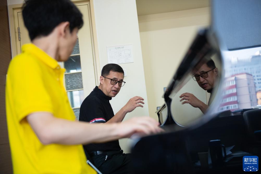 9月14日,中央音樂(lè )學(xué)院教授韋丹文(后)指導鋼琴系學(xué)生練習莫扎特的《A大調鋼琴協(xié)奏曲K.414》。