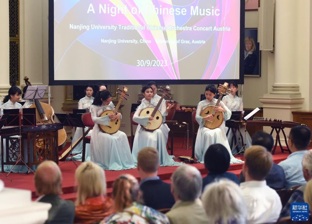 9月30日,在奧地利格拉茨,南京大學(xué)民族樂(lè )團成員在演奏《絲路駝鈴》。當日,南京大學(xué)民族樂(lè )團在奧地利格拉茨舉辦“絲路華韻”音樂(lè )會(huì ),為現場(chǎng)觀(guān)眾帶來(lái)具有濃郁中國特色的藝術(shù)盛宴,慶祝中秋佳節。