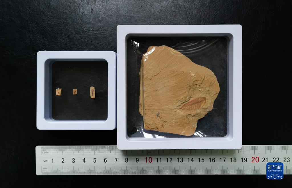 這是10月11日在云南大學(xué)古生物研究院實(shí)驗室里拍攝的名為迷人林喬利蟲(chóng)的化石,從左到右為不同生長(cháng)時(shí)期的迷人林喬利蟲(chóng)。