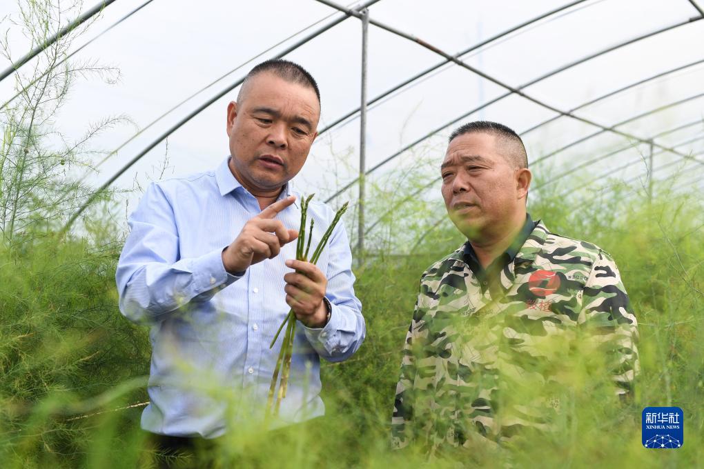 10月11日,在漣水縣紅窯鎮金城村,淮安市人大代表鄭標(左)給蘆筍種植戶(hù)傳授管護知識。鄭標是當地蘆筍種植大戶(hù),帶領(lǐng)許多村民走上種植蘆筍之路。