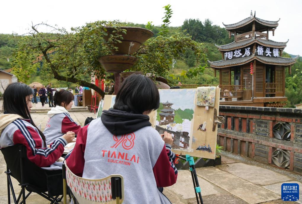 10月10日,來(lái)自重慶天籟藝術(shù)學(xué)校的學(xué)生們在橋頭鎮的陶然居瓦屋小寨內進(jìn)行風(fēng)景繪畫(huà)寫(xiě)生。小寨優(yōu)美的環(huán)境吸引了不少學(xué)校在此設立寫(xiě)生基地。