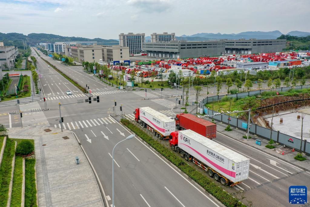 10月11日,滿(mǎn)載筆記本電腦配件、發(fā)電機組件等產(chǎn)品的西部陸海新通道跨境公路班車(chē)從重慶南彭公路保稅物流中心駛出,將途經(jīng)廣西憑祥,直達越南(無(wú)人機照片)。