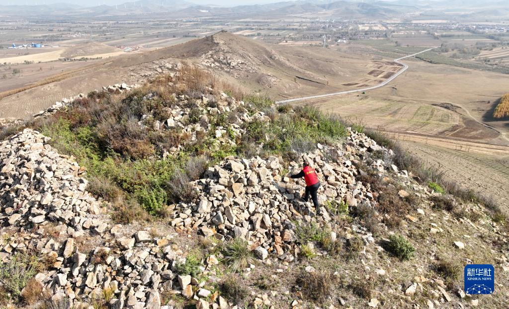 10月11日,關(guān)富軍攀上長(cháng)城一座烽火臺巡查(無(wú)人機照片)。