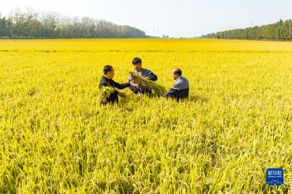 10月11日,在河北省唐山市曹妃甸區第五農場(chǎng)鹽堿地改良而成的高標準稻田,農業(yè)科研人員采集測產(chǎn)稻樣(無(wú)人機照片)。