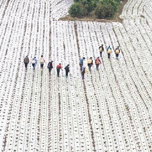 10月11日,在蓬安縣錦屏鎮中壩社區蔬菜種植基地,村民在田地里進(jìn)行蘿卜幼苗“破膜露苗”作業(yè)(無(wú)人機照片)。