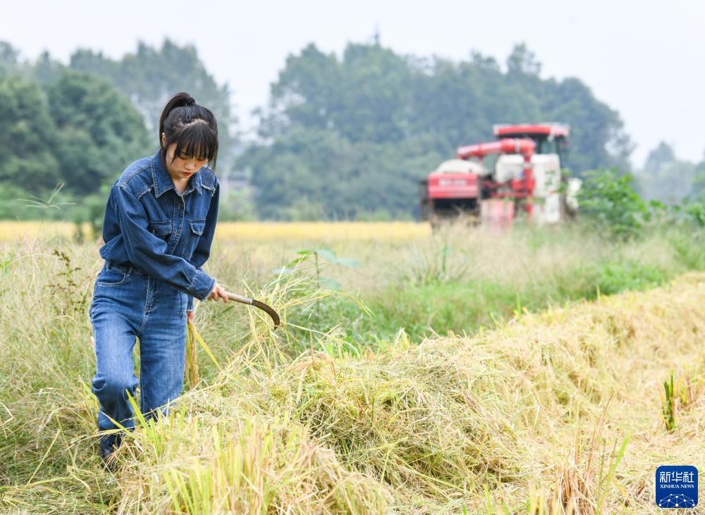 10月10日,在成都市雙流區彭鎮,王伶俐在田埂補割收割機未覆蓋區域的水稻。
