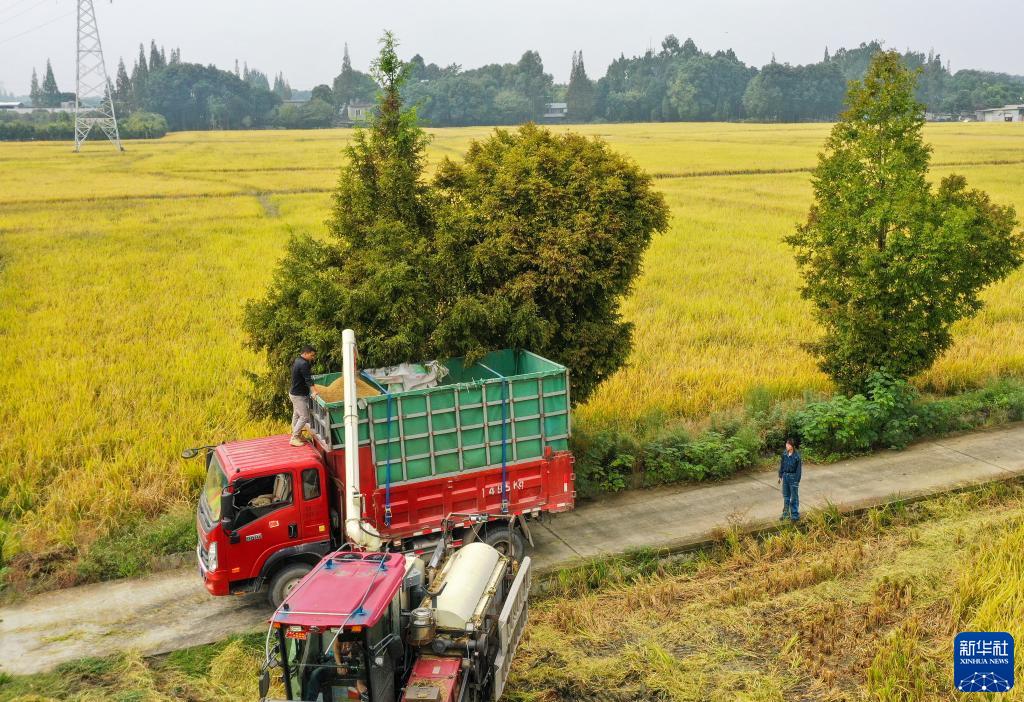 10月10日,在成都市雙流區彭鎮,王伶俐(右)在查看水稻收割后的裝車(chē)情況(無(wú)人機照片)。