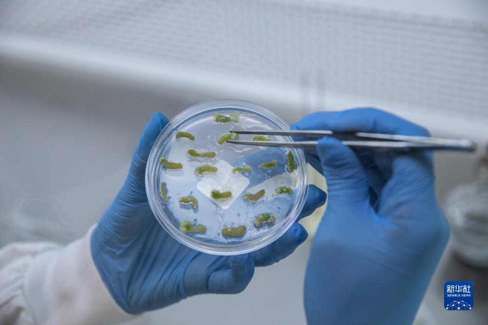 10月11日,一名科研人員在位于巴西圣保羅州克拉維紐斯的隆平巴西分子生物實(shí)驗室內查看育種繁育情況。