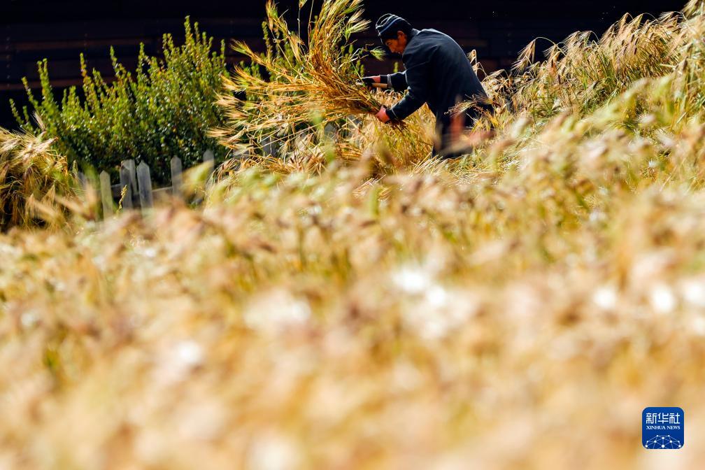10月12日,在四川甘孜藏族自治州稻城縣亞丁村,村民在收割青稞。