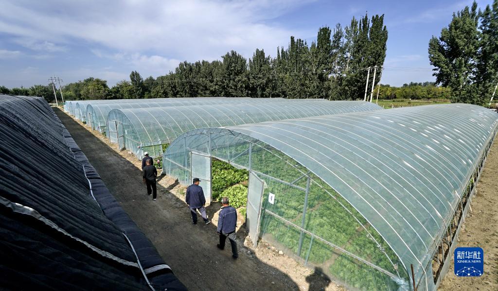 10月10日,農民在巡視“五村聯(lián)營(yíng)”村共同出資在潞城營(yíng)一村建設的訂單蔬菜大棚。