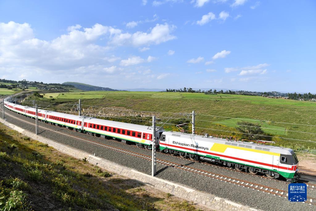 2016年10月3日,在埃塞俄比亞首都亞的斯亞貝巴附近,一列試運行列車(chē)在亞吉鐵路上行駛。亞吉鐵路由中國中鐵下屬的中鐵二局和中國土木工程集團有限公司聯(lián)合承建并運營(yíng),連接埃塞俄比亞和吉布提,是非洲第一條跨國電氣化鐵路,全長(cháng)752.7公里。