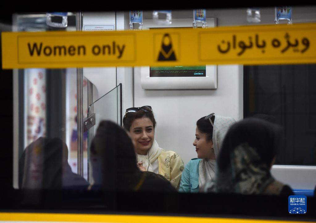 2016年9月4日,幾名女性乘客在伊朗德黑蘭乘坐地鐵。伊朗首都德黑蘭5條地鐵線(xiàn)全部由中國公司承建,其中德黑蘭地鐵1、2號線(xiàn)由中信國際承建,3、4、5號線(xiàn)由北方國際承建;地鐵車(chē)輛由中伊合資的德黑蘭軌道車(chē)輛制造公司(由中國的北方國際合作股份有限公司、中國中車(chē)長(cháng)春軌道客車(chē)股份有限公司和伊朗綠菠蘿工業(yè)集團在伊朗合資成立)提供。
