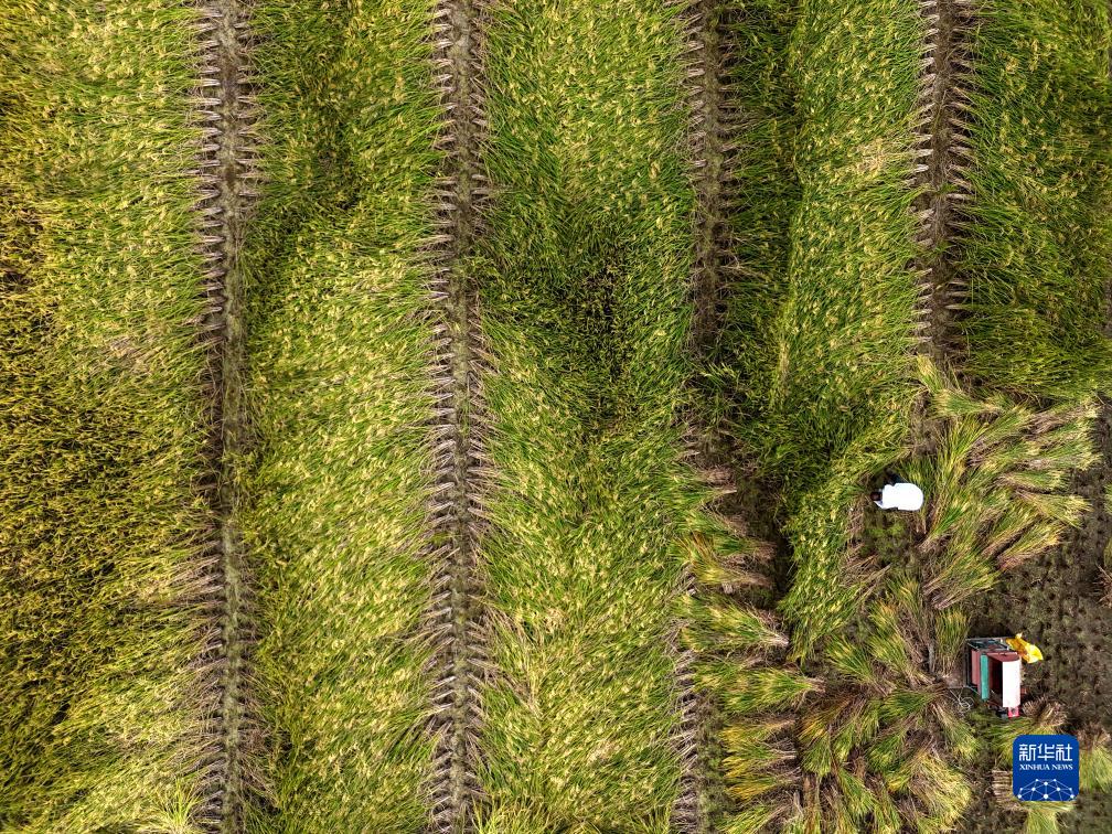10月12日,農戶(hù)在浙江省樂(lè )清市白石街道密川村田間收割稻谷(無(wú)人機照片)。