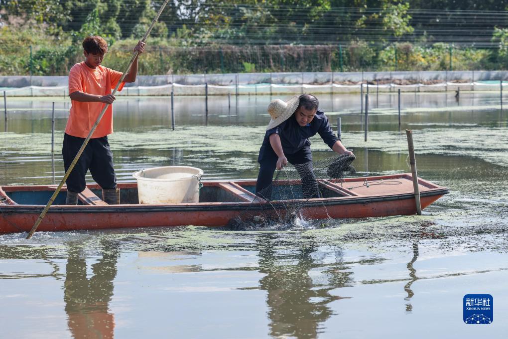 10月12日,蟹臨門(mén)太湖蟹共富養殖基地的蟹農在養殖基地內捕撈太湖蟹。
