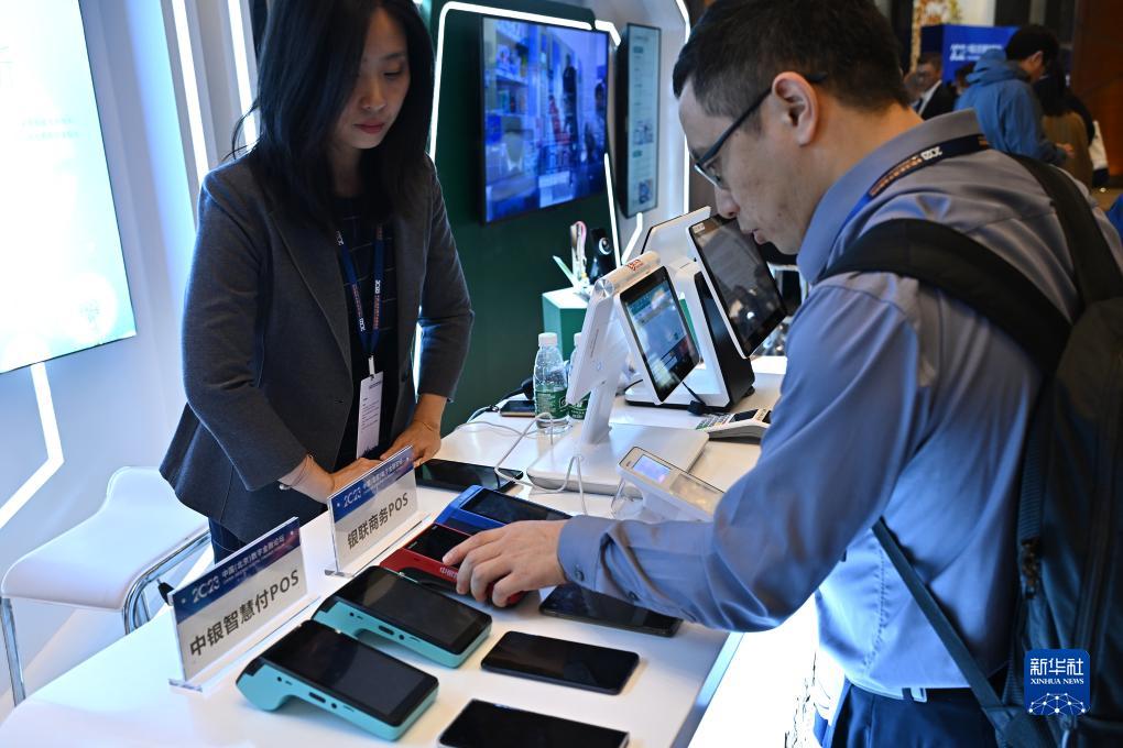 在論壇設置的數字人民幣體驗區,與會(huì )者在中國銀行展臺了解具有數字人民幣功能的POS機(10月12日攝)。