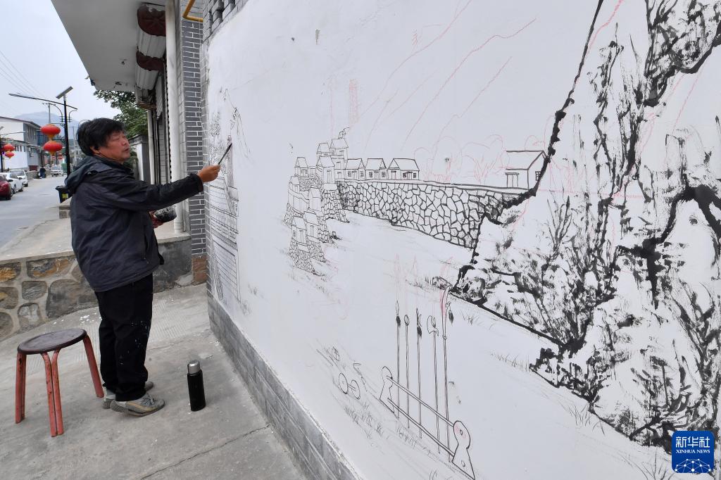 10月12日,工作人員在石家莊市鹿泉區東土門(mén)村進(jìn)行墻體彩繪。