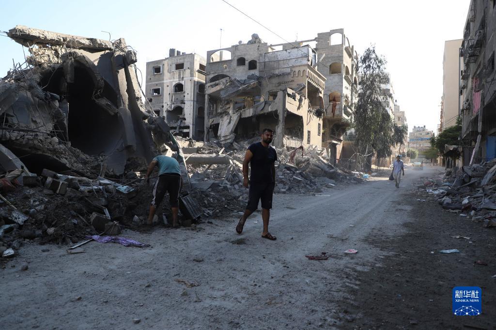 10月12日,在加沙城,路人經(jīng)過(guò)被以色列軍隊空襲炸毀的建筑。