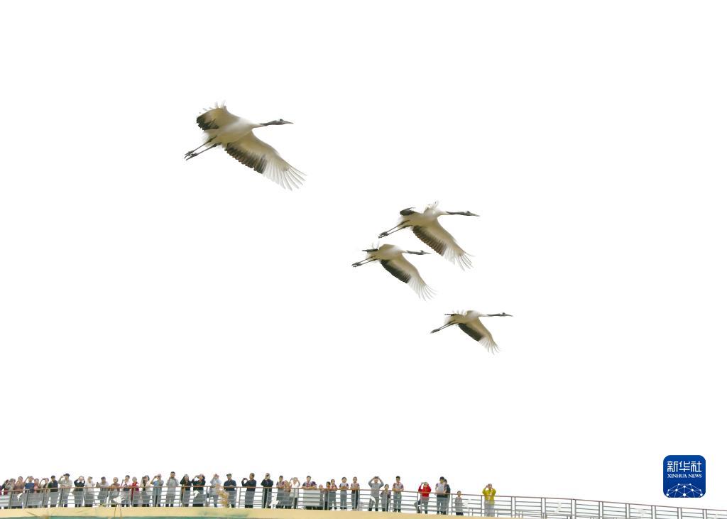 10月12日,一群丹頂鶴在東營(yíng)黃河三角洲濕地飛翔。