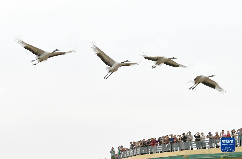 10月12日,一群丹頂鶴在東營(yíng)黃河三角洲濕地飛翔。
