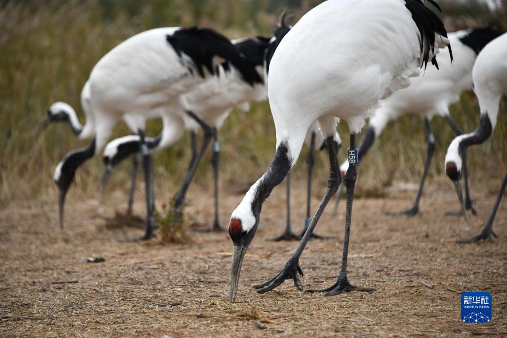 一群丹頂鶴在東營(yíng)黃河三角洲濕地棲息(10月12日攝)。