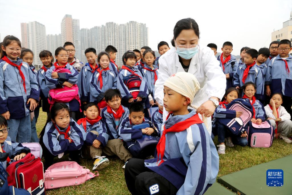 10月13日,在江蘇省連云港市院前小學(xué),醫護人員為學(xué)生講解急救常識。