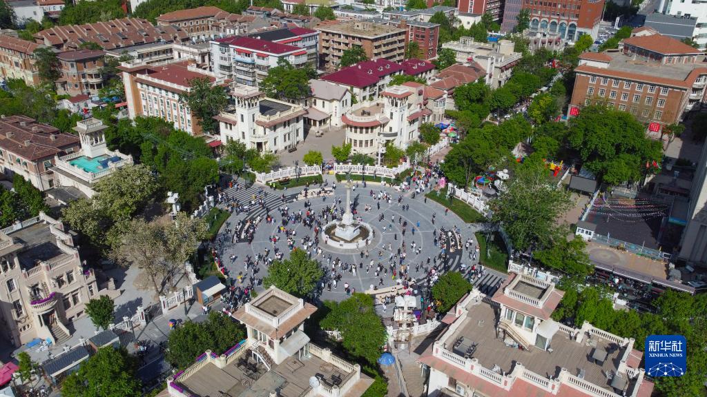 這是2021年5月1日拍攝的位于天津市河北區的意式風(fēng)情街馬可波羅廣場(chǎng)(無(wú)人機照片)。