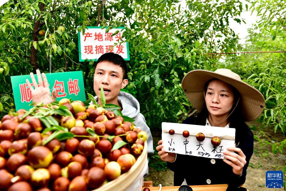 10月12日,在濱州市沾化區下洼鎮,電商主播在棗園里直播賣(mài)冬棗。