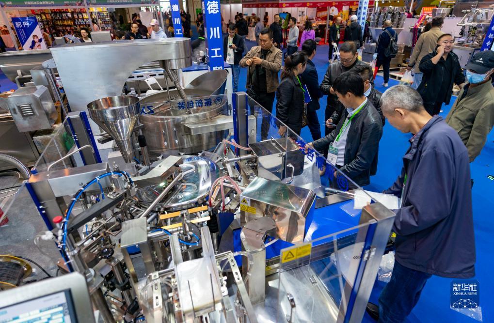 10月13日,參觀(guān)者在云南國際餐飲美食暨預制菜產(chǎn)業(yè)博覽會(huì )上參觀(guān)一臺食品包裝設備。