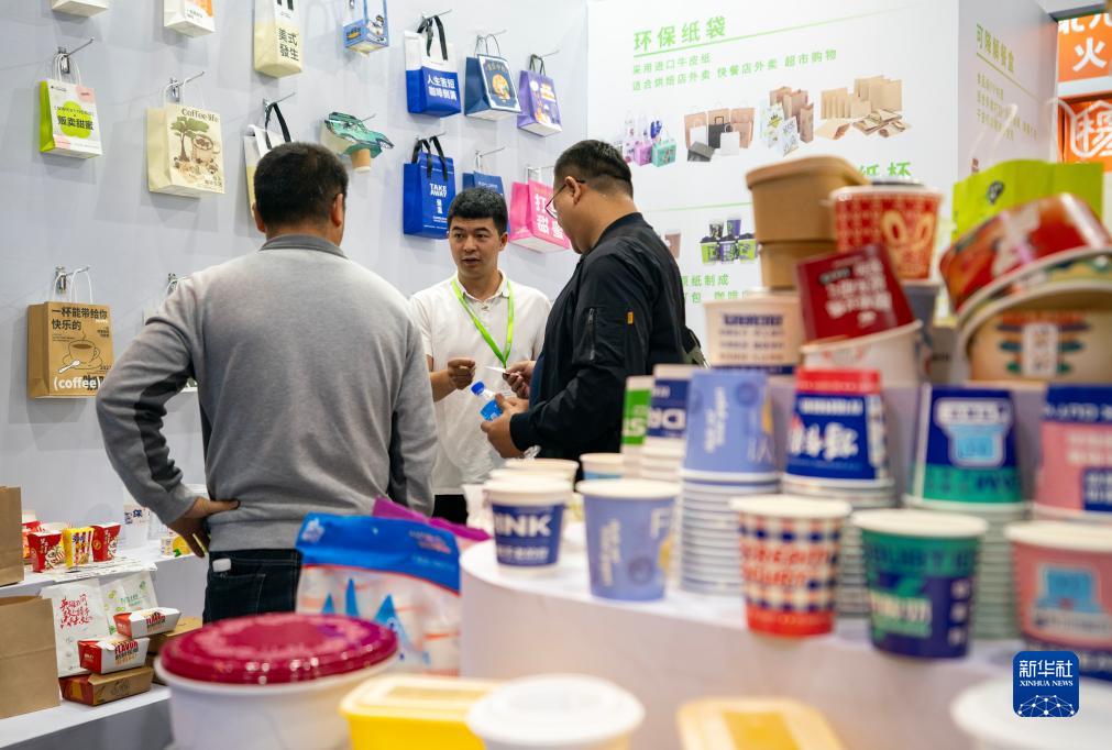 10月13日,一名參展商(左二)在云南國際餐飲美食暨預制菜產(chǎn)業(yè)博覽會(huì )上向兩名參觀(guān)者介紹食品包裝產(chǎn)品。