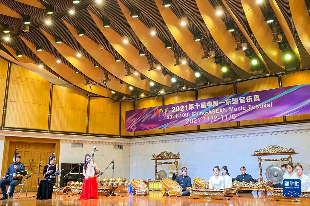 仁迪(左四)帶領(lǐng)樂(lè )團成員在第十屆中國—東盟音樂(lè )周上演出(2021年11月3日攝)。