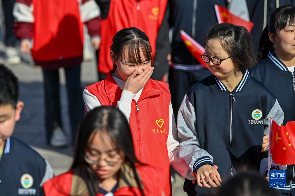 10月13日,志愿者和盲校學(xué)生在太原汾河公園交流。
